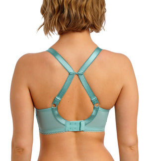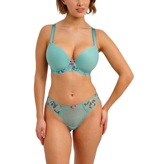 The Freya Love Crush Molded Plunge Underwire T-Shirt Bra (403231) looks stunning with its romantic floral embroidery and finished with a dainty rosebud charm for a feminine touch. This style is based on the Freya Deco Molded Plunge Underwire Bra (4234). This t-shirt bra features a seamless, padded, underwire cup that disappears under clothing and a flattering plunge neckline. The shoulder straps are fully adjustable and convert to racerback via a j-hook option for a customized fit. Beautiful floral embroidery on the cradle and picot elastic trims give this molded bra a romantic feel.