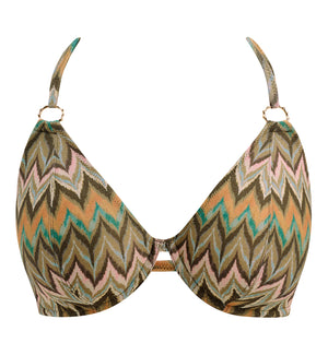 The Freya Arizona Wave Underwire Halter Bikini Top (206104) makes a splash this swim season with its lush greens and varying shades of neutral tones, inspired by the stunning beauty of mountainous landscapes. Glisten in the sun with metallic yarn accents sewn throughout this fabric. This underwire bikini features a low plunging neckline and no cradle for less coverage and a flattering fit. The cups are lined with a power net fabric for shaping and support. The halter straps tie securely behind the neck to allow a customized fit and have an interesting decorative ring detail.