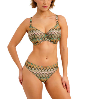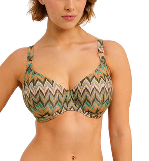 The Freya Arizona Wave Underwire Plunge Bikini Top (206102) makes a splash this swim season with its lush greens and varying shades of neutral tones, inspired by the stunning beauty of mountainous landscapes. Glisten in the sun with metallic yarn accents sewn throughout this fabric. This underwire bikini features a plunge neckline for less coverage and a flattering fit. The fully adjustable shoulder straps allow you customize your fit and offer an interesting decorative ring detail. The cups are lined for shaping and support.