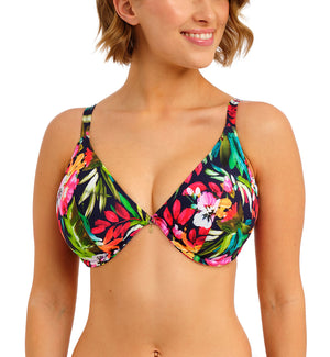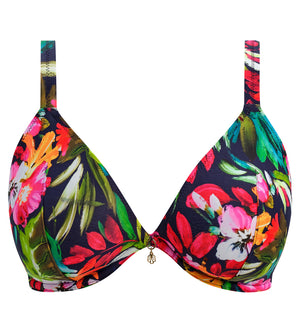 The Freya Kailua Shores Plunge Underwire Bikini Top (207927) will have you hitting the waves in style with its colorful tropical print, fusing this swim season's trending colors of hot pinks, fiery oranges and luscious jades across a rich navy background. This exotic underwire bikini top features a flattering plunge neckline and off the cradle wire for less coverage. The one piece darted cups offer minimal seams and are lined for added support. The shoulder straps are fully adjustable and convert to a racerback style via a j-hook design.