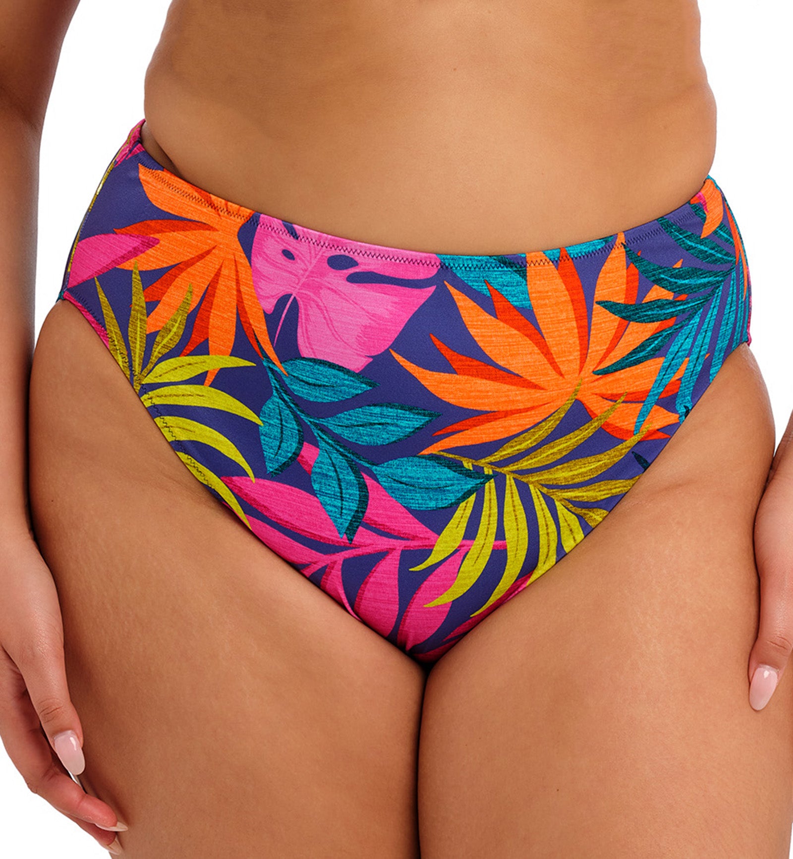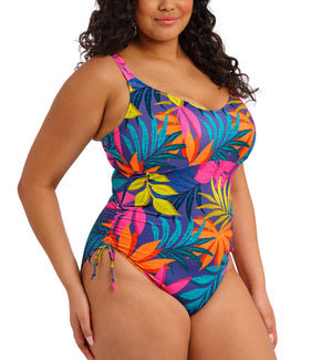 Soak up the sun this season with the Elomi Porto Rafti Non Wire One Piece Swimsuit (ES803343) inspired by sun-kissed shores and tropical escapes. This swimwear range features lush textured palm leaves in jewel tones of pink, turquoise, lime and orange over a calming ocean blue base. This one piece features a flattering scoop neckline and sexy keyhole back design. The wire-free cups are non-padded for quick drying time. The suspended shelf support has a wide under band frame for support with a less structured shape for a natural silhouette. The tie sides offer coverage adjustability for your comfort level. The straps also adjust to create a custom fit and feel. For a more revealing style, check out the Elomi Plain Sailing Super Plunge Non Wire One Piece Swimsuit (ES7280), sold separately.