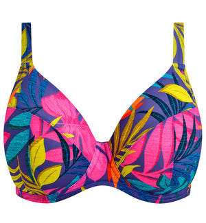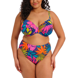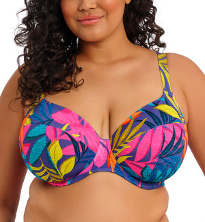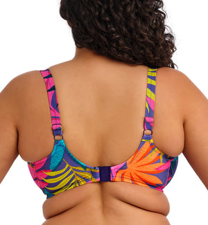 Soak up the sun this season with the Elomi Porto Rafti Underwire Plunge Bikini Top (ES803302) inspired by sun-kissed shores and tropical escapes. This swimwear range features lush textured palm leaves in jewel tones of pink, turquoise, lime and orange over a calming ocean blue base. This flattering plunge underwire swim top is fully lined with a light but supportive fabric for a bikini look with the fit of an Elomi lingerie bra. The shoulder straps can be adjusted to create a custom fit. Check out the matching swim bottoms Elomi Porto Rafti Adjustable Bikini Brief (ES803373) and Elomi Porto Rafti Mid Rise Bikini Brief (ES803372) for a coordinating swim set, sold separately.