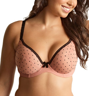The Panache Gabrielle Non Padded Underwire Plunge Bra (11316) captivates in its timeless polka dot style that exudes charm and sophistication. This lingerie range has flocked polka dots and feminine lace trims, for the perfect blend of vintage-inspired allure and modern femininity. This bra features a plunging neckline that showcases the perfect amount of cleavage. The underwire cups are made of a rigid tulle fabric and are free of padding, which accentuates your natural shape. Pairs perfectly with the Panache Gabrielle High Waist Brazilian Brief (11312) or Panache Gabrielle Thong (11319) for a matching lingerie set, sold separately.