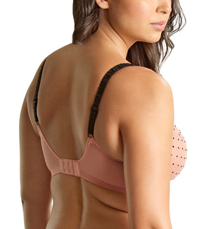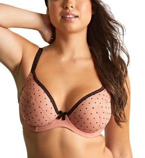 The Gabrielle Flocked Dot Bra by Panache blends playful charm with vintage-inspired design. Its sheer mesh cups are adorned with delicate black flocked polka dots, giving it a look that’s both flirty and sophisticated. The fit is comfortable for all-day wear, with a soft and lightweight feel against the skin. While it offers gentle shaping and support, it doesn’t provide dramatic lift, making it a great option for those who prefer a more natural silhouette. This plunge-style bra runs slightly full in the cup, so if you’re between sizes, you may find the best fit by sizing one size down in the cup. Otherwise, it runs pretty true to size.