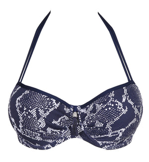 The Prima Donna Kala Padded Balcony Underwire Bikini Top 400-3916 is a balcony swim top with lightly padded cups. The split spaghetti straps are fully adjustable and convertible so you can criss-cross the back. Trendy snake print batik pattern on dot textured fabric really pops with contrasting navy blue and crisp white.