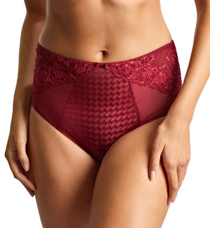 This high-waist panty is cheeky and sexy but still functional. This deep brief is excellent for pear and hourglass body shapes, as well as ladies who have a little tummy or "love handles", and ladies with a really full booty. The houndstooth front panel plus slightly higher waist coverage smooths any bumps or imperfections, while the cheeky-short/brazilian stretch lace on the rear will flex to your backside whether you have a little or a lot. I love this particular panty shape from Panache because it is flattering under clothing and works for many different body types. Gorgeous fashion colors each season keep this panty on-trend.