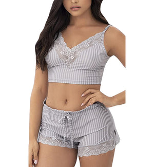 The Mapale 2 Piece PJ Set: V-Crop Top & Side Slit Short (7394) features fun and flirty styling with a blend of floral lace and pinstriping for a subtly sexy sleepwear set. The cropped camisole-style top has a deep V-neck lined with floral lace, adjustable spaghetti-strap shoulders, and a second deep-V in the back for a peekaboo peek at more lace. The shorts have a modified paperbag-waist look with semi-sheer floral lace at the hem. This pajama set keeps you cozy and comfortable while still feeling cute.