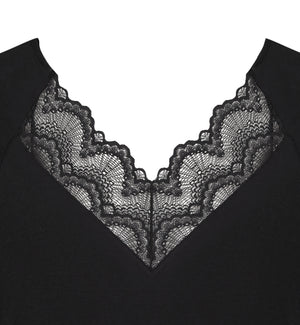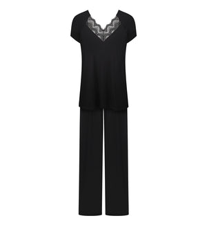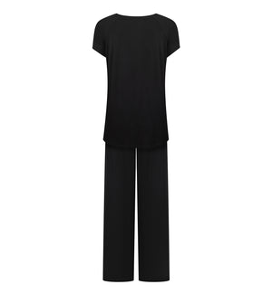 The effetto Bamboo Basics Pajama T-Shirt and Pants Set (02101) is a gorgeous, lightweight pj set composed of super soft bamboo viscose material that will keep you cool and comfortable all night long. This sleep set includes a short sleeved t-shirt and full length pants. The v-cut neckline of the t-shirt is trimmed in luxury lace that's cut by hand and has delicate details for a decadent look. Check out the ravishing effetto Bamboo Basics 3/4 Sleeve Robe (02105) for a coordinating sleep set, sold separately.