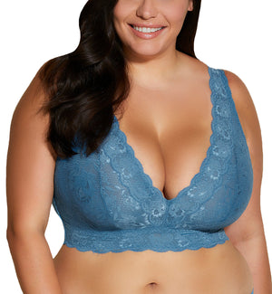 The Cosabella Never Say Never SUPER CURVY Plungie Longline Bralette (NEVER1389) is a totally wireless leisure bra made of soft, pearlescent, semi-sheer stretch lace that is perfect for lounging or sleeping. Featuring a flex-mesh liner in the entire bra and additional underbust sling to avoid that 'hanging down' appearance, plus back adjustable straps, and a flex lace longline band, you'll have the look of a soft bra but with a better fit for your full figure curves. Part of the Cosabella SUPER Curvy line of bralettes structured to provide better support and lift for very large busts with more narrow ribcages.
