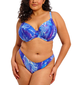 The Elomi Maluku Island Plunge Underwire Bikini Top (ES802902) embraces a fresh wave of excitement this swim season with its abstract botanical palm print in shades of cool blue, pops of funky fuchsia and crisp white details. This swim top features a plunge neckline with concealed elastic to hug your curves. The underwire cups are multi-sectioned for forward, lifted shape and support. This top is fully lined with lightweight fabric for a quick drying design. The straps are adjustable for a custom fit and feel. Check out the matching swim bottoms Elomi Maluku Island High Leg Bikini Brief (ES802985) and Elomi Maluku Island Adjustable Side Swim Brief (ES8029763) for a coordinating swim set, sold separately.