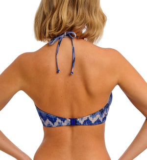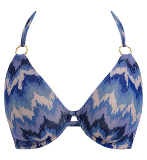 The Freya Arizona Wave Underwire Halter Bikini Top (206104) makes a splash this swim season with its ocean blue color palette, inspired by twilight skies and shimmering waves. Glisten in the sun with metallic yarn accents sewn throughout this fabric. This underwire bikini features a low plunging neckline and no cradle for less coverage and a flattering fit. The cups are lined with a powernet fabric for shaping and support. The halter straps tie securely behind the neck to allow a customized fit and have an interesting bamboo ring detail.