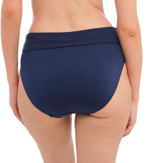 The Fantasie Ottawa Fold High Waist Swim Brief (6497 has a high waist that sits below the navel with a figure-flattering foldover detail. This classic bikini bottom features moderate rear coverage, a metallic charm along one leg openings, and a decorative side-tie at the side. Pairs perfectly with the Fantasie Ottawa Plunge Underwire Convertible Bikini Top (6495), sold separately.