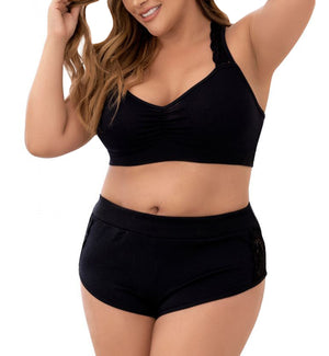 The Mapale 2 Piece PJ Set: Racer Crop Top & Cheeky Short PLUS size (7389X) combines a bralette-style crop top with racerback styling and lace-trimmed shorts for a cute, comfortable plus-sized lounging and sleepwear look. With ruched gathers at the center bust for definition, a strong underbust band, and fixed racerback shoulder straps, the top has an athleisure look that's always on-trend. The pajama shorts have beautiful lace trim along the sides, showcasing a hint of skin. More ruching at the rear emphasizes a rounded shape, and the triangle detail at the rear waistband draws the eye. You'll love this fun and flirty PJ set worn alone for sleeping or with a t-shirt thrown over to wear around the house!