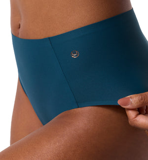 Evelyn & Bobbie High-Waisted Retro Bikini Panty (1704) is a retro-style brief panty with a high waist that sits just below the navel, featuring a cotton gusset and high-cut leg openings that flatter and visually lengthen the legs. This no-show panty is SUPREMELY comfortable and boasts double-bonded seams that lay flat under clothing (even leggings) to prevent visible panty lines. This retro panty offers moderate coverage, slightly cheeky along the outer rear. Evelyn & Bobbie dedicates their brand to a "do no harm" ethos, so your favorite undies are always BPA-Free, Latex-Free, Copper-Free, Nickel-Free, and Non-Toxic.