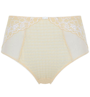 This high-waist panty is cheeky and sexy but still functional. This deep brief is excellent for pear and hourglass body shapes, as well as ladies who have a little tummy or "love handles", and ladies with a really full booty. The houndstooth front panel plus slightly higher waist coverage smooths any bumps or imperfections, while the cheeky-short/brazilian stretch lace on the rear will flex to your backside whether you have a little or a lot. I love this particular panty shape from Panache because it is flattering under clothing and works for many different body types. Gorgeous fashion colors each season keep this panty on-trend.