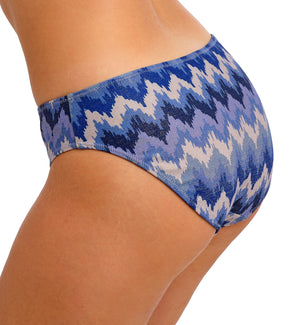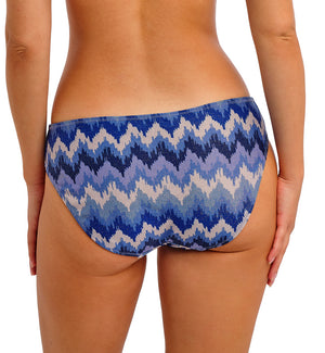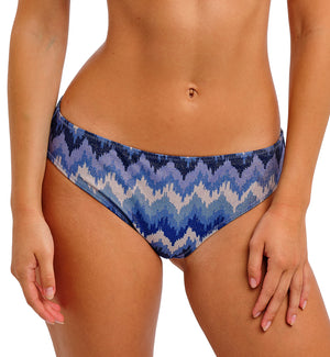 The Freya Arizona Wave Bikini Swim Brief (206170) makes a splash this swim season with its ocean blue color palette, inspired by twilight skies and shimmering waves. Glisten in the sun with metallic yarn accents sewn throughout this fabric. This is a classic bikini bottom with a mid-rise waistband that sits on the hips on most figures. The high-cut leg openings provide a flattering lengthened look to your legs. Moderate rear coverage.