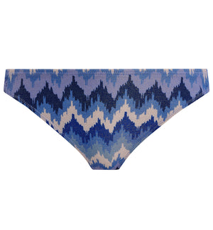 The Freya Arizona Wave Italini Swim Brief (206184) makes a splash this swim season with its ocean blue color palette, inspired by twilight skies and shimmering waves. Glisten in the sun with metallic yarn accents sewn throughout this fabric. This is a low-rise bikini bottom that sits along the lower hip on most. The rear offers cheeky rear coverage. The hips are adorned with a decorative bamboo style ring to add visual interest.