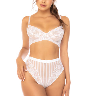 The Mapale Emberly Two Piece Set (8842) exudes sophistication and sexy sheerness in a set of lingerie you're sure to love. This transparent mesh and lace lingerie set features beautiful floral lace and classic stripe mesh for a timeless look. The long line bralette features adjustable shoulder straps and a wire free design for comfort. The high waisted panty has cheeky rear coverage. Pair with a pair of Mapale Mesh & Lace Thigh High Stockings (1094) for a sexy lingerie set, sold separately.