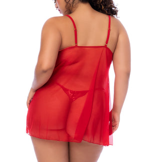 The Mapale Surreal Ruby Passion Babydoll & Thong PLUS (7559X) is a sexy 2-piece lingerie set with a hint of sweetness. Set includes a semi-sheer babydoll with split panels at the front, plus a matching Thong. Features deep-V plunge neckline, floral sequin design on cups and adjustable straps. Coordinate with Mapale Mesh & Lace Thigh High Stockings PLUS (1094X) for a matching set, sold separately.