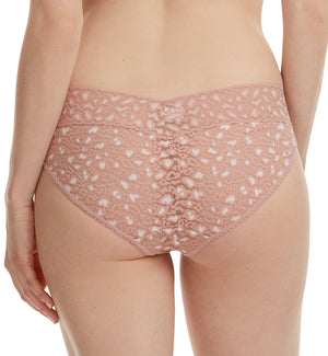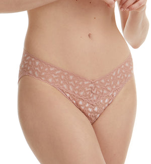The Hanky Panky Cross Dyed Leopard V-kini (7J2371) has a trendy mid-rise waistband and allover stretch lace in a subtle leopard print. This panty is crafted from Hanky Panky's signature soft lace for comfortable all-day wear with fun and flirty style. Features moderate rear coverage.