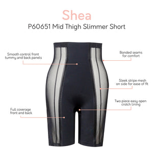 Parfait Shea Mid Thigh Slimmer Short (P60651) provides comfortable control from your bra to your thighs, so you can feel confident, smooth, and sleek under any outfit. This shaper short is essential to your wardrobe, offering features like bonded seams for a no-show hug, smoothing tummy and back panels for additional control, and breathable mesh fabric. Who knew shapewear could be so comfortable?