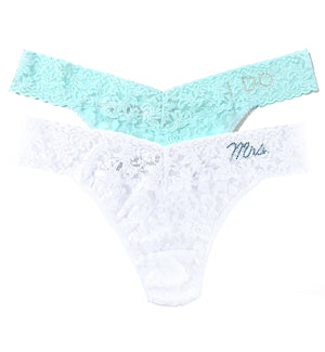 The Hanky Panky Bridal I DO & MRS Original Rise Thong 2-PACK (48MRSBX) sits higher on the hips and is made of Hanky Panky's comfy signature stretch lace. One thong is white and features "Mrs." in cursive writing on your left hip, adorned in beautiful, sparkling blue rhinestones. The other is light blue and features "I DO" in manuscript writing on your left hip, adorned in beautiful, sparkling clear rhinestones. These thongs can serve double duty for your "something blue" and "something new" on your wedding day.