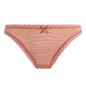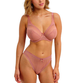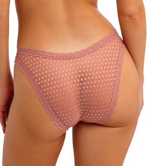 Take center stage this season with the Freya Spot Light High Leg Brief (403953). This all-lace panty features sexy sheer spot mesh paired with feminine lace trims. The high cut leg openings flatter your silhouette and elongate your legs. This brief offers a mid rise waist and cheeky rear coverage in an all-over sheer mesh fabric. Cute satin ribbon bow and metallic disc charm finish this panty with a feminine touch. Check out the matching bra Freya Women's Spot Light Plunge Underwire Bra (403905) for a coordinating lingerie set, sold separately.