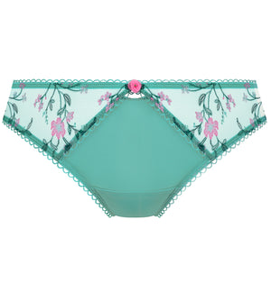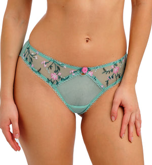 The Freya Love Crush Brief (403250) looks stunning with its romantic floral embroidery and finished with a dainty rosebud charm for a feminine touch. The sheer hip panels are adorned with the floral embroidery, while the front and back panels are not. The waistband is a low rise design, sitting at the hips on most and features a keyhole detail. The back features a double layered mesh with gathered detail at the seam and folded leg edge that provides a smooth finish. Picot elastic trims add a touch of femininity.