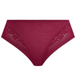 The Elomi Nerina Matching High Leg Brief (302753) combines retro-inspired style with beautiful mesh fabric. The front and back is lined for modesty and features mesh lace side panels to add detail and interest. This high waisted panty is a true high leg brief option, with the waist coverage sitting at or just above the belly button and leg holes extending steeply upward. This style provides a smooth hipline and no-show waistline under fitted clothing. Check out the coordinating bras Elomi Nerina Stretch Lace Plunge Underwire Bra (302734) or Elomi Nerina Spacer Seamless Molded Underwire Bra (302710) for a matching set, sold separately.