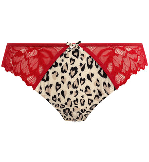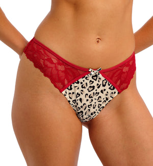 Crafted with delicate stretch lace in a vibrant red, the Cherish Me Thong by Freya offers a smooth, curve-hugging look. The red lace and bold leopard print will spice up any set but look fantastic with the Cherish Me Molded Bra or Non-Molded Bra. This bottom runs true to size, so order your normal thong size.