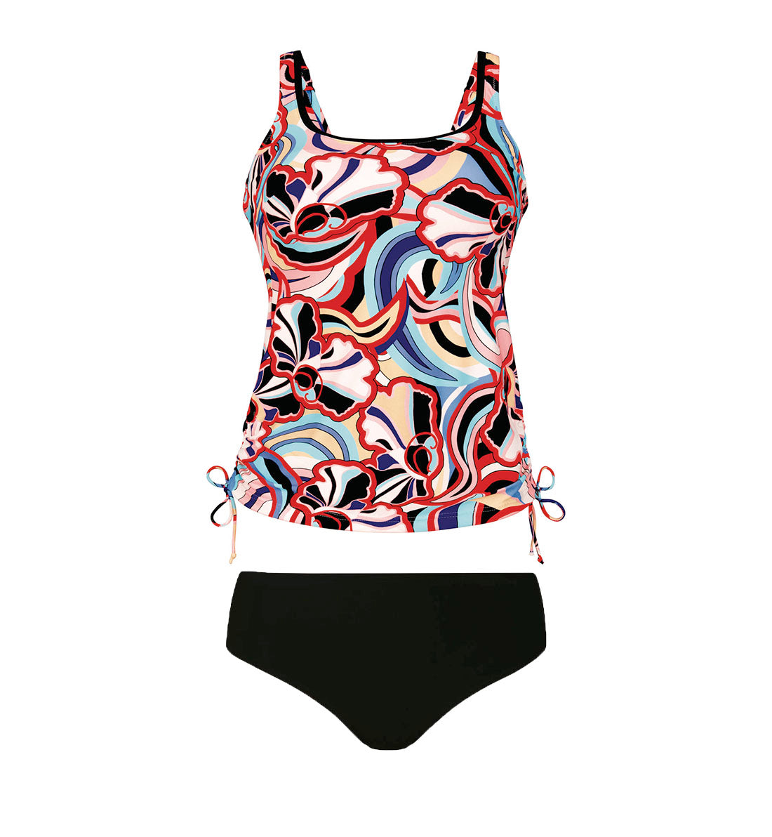 The Anita Retro Vision Belinda Adjustable Side Tankini (8477) is a full tankini set including top and bottom in a fun, retro-inspired print. This tankini has soft wireless cups with optional removable padding and shaping, plus ruched sides that adjust to let you decide what length is most comfortable for you. The high neckline keeps your bustline nicely covered and shielded from the sun.