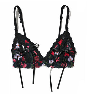 Hanky Panky After Midnight Peek-a-Boo Front Tie Bralette (PR487836) is a semi-sheer lace printed bralette with flirty satin tie fronts at the center of each cup. This triangle cup bralette offers adjustable straps. Pair with Hanky Panky After Midnight Open Gusset Thong or Open Cheeky Hipster, sold separately, for a lingerie set that will make their jaw drop.