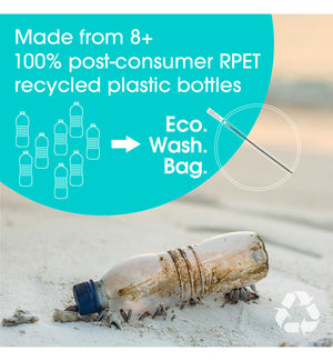 Material Content: 100% RPET (post-consumer recycled plastic bottles). Each Eco wash bag diverts 8+ plastic bottles from the environment.