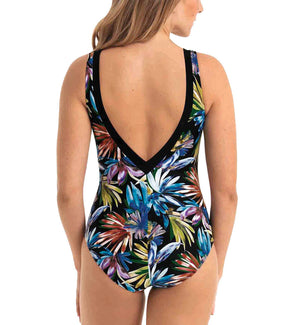 The Anita Night Flowers Gabriella One-Piece Swimsuit (7467) is will make you feel confident and stunning in this figure flattering one piece swimsuit. The deep v-neck neckline in front and back expertly accentuates your curves. The shaping inserts create a slimming effect and hug your silhouette in all the right places. This wire-free suit was designed with comfort in mind for all day wear. Check out the Anita Care Night Flowers Girona Swim Tankini (6573-1) in the same great print, sold separately.