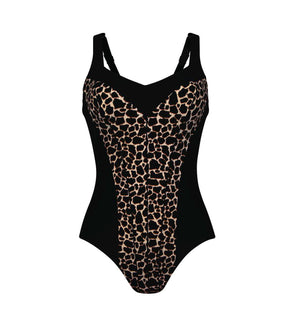 Anita Trendy Giraffe Teresa Slimming Support One Piece Swimsuit (7330) features special tailoring that creates a slimming effect, medium support control lining, and a soft V-neckline with concealing cups hidden inside for modesty. This swimsuit has adjustable straps and a rounded, low-cut back and moderate rear coverage. This exquisite animal print is placed perfectly to enhance your curves and surrounded by sleek black that never goes out of style.