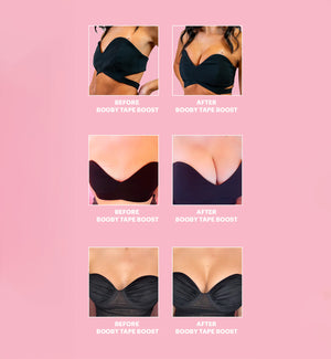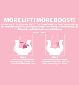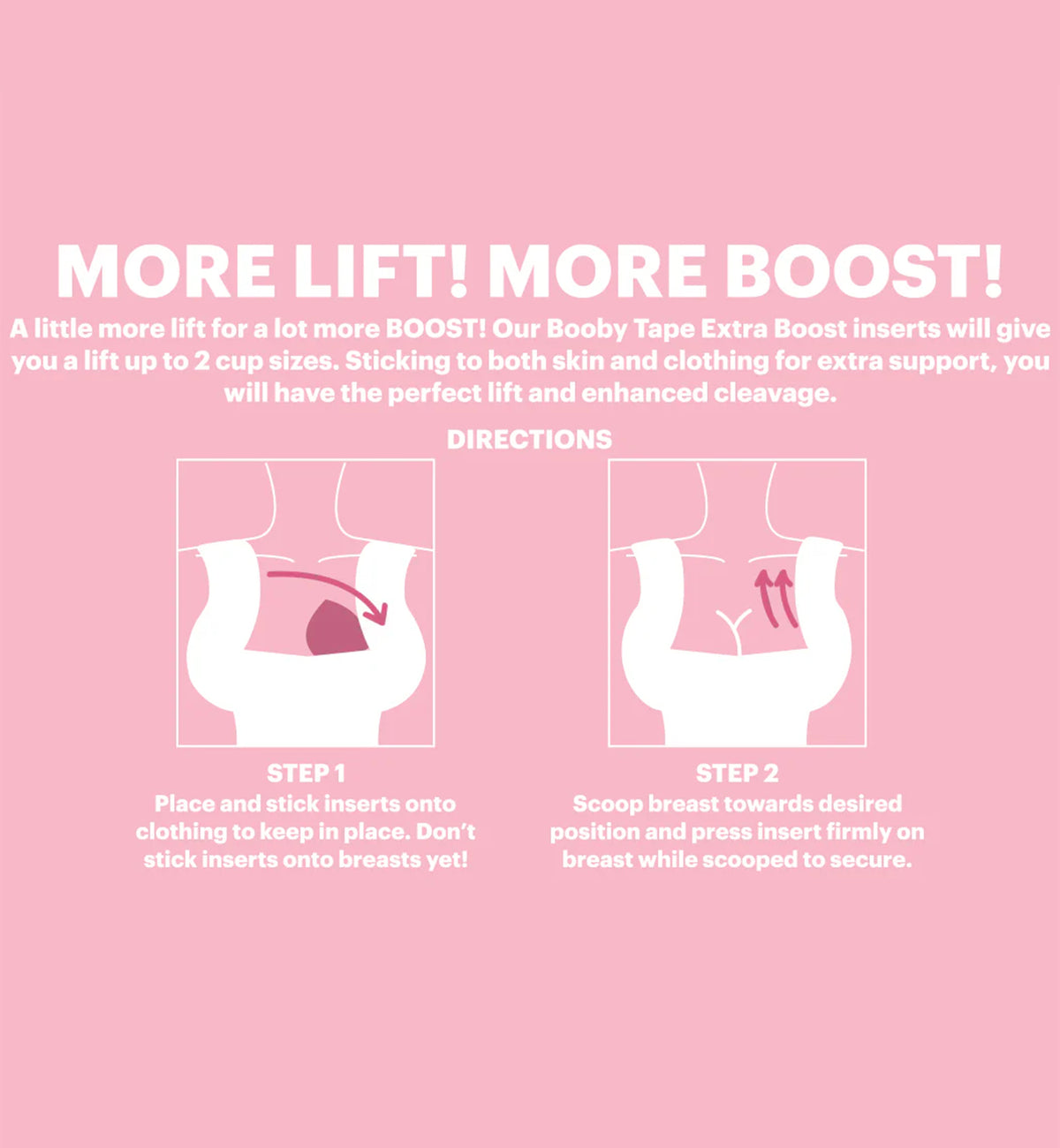 Booby Tape Boost Inserts are a double-sided adhesive cup insert made to enhance your cleavage and provide additional boost equal to one cup size. This adhesive cup is reusable and waterproof, making it a great solution to a bustline that is lacking under that dress or top you are dying to wear. Booby Tape Boost is sticky on both sides for extra support.