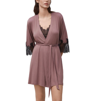 The effetto Bamboo Enigma 3/4 Sleeve Robe (03332) is a gorgeous, lightweight robe composed of super soft bamboo viscose material that will keep you cool and comfortable. This robe features 3/4 sleeves and front wrap ties. The luxury lace is cut by hand and has a decadent look. This robe ends at mid thigh on most. Check out the ravishing effetto Bamboo Enigma Chemise w/ Breast Support (03335) for a coordinating sleep set, sold separately.