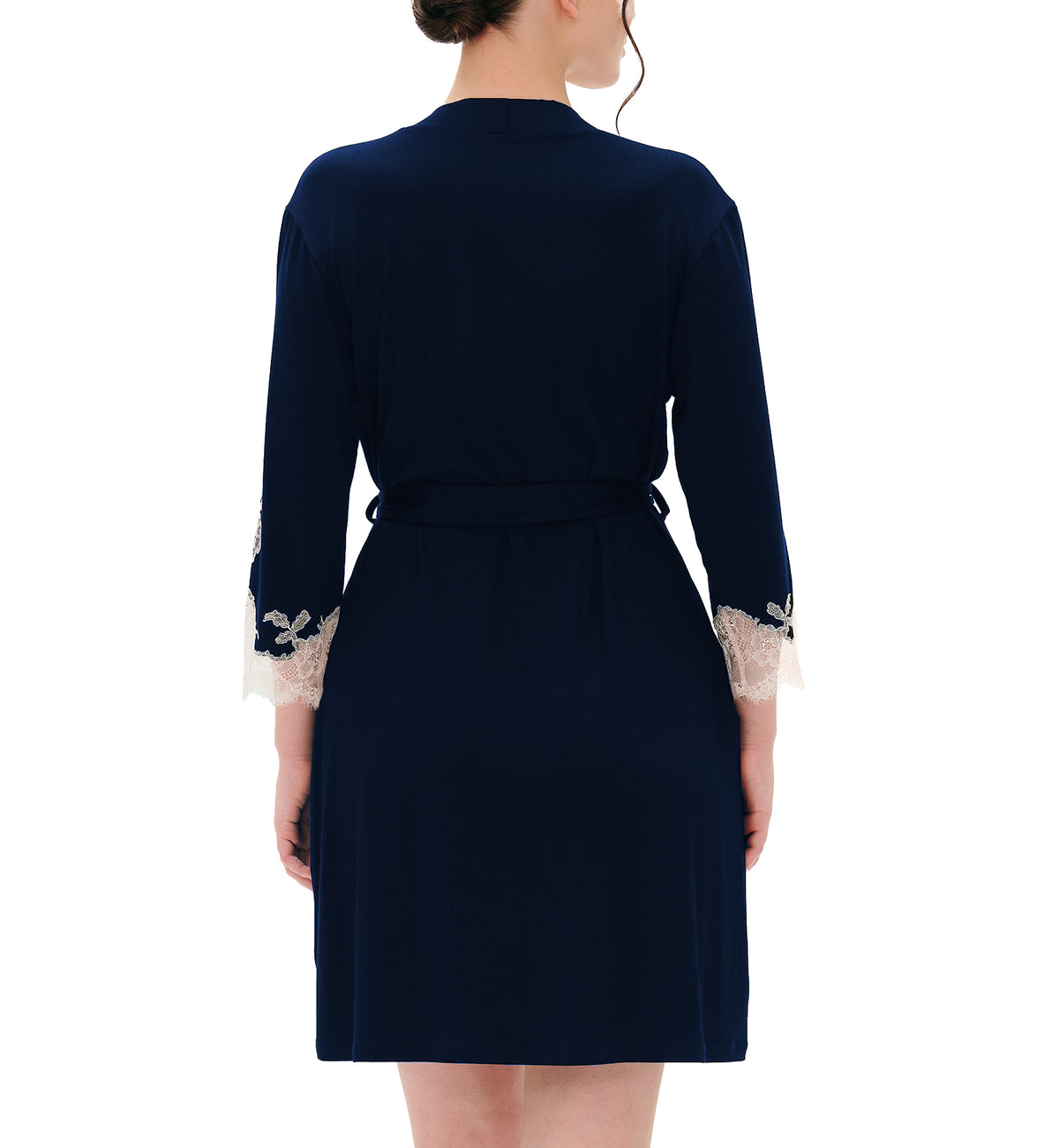 The Effetto Gone with the Wind 3/4 Sleeve Robe is a luxurious and timeless addition to your loungewear wardrobe, inspired by classic Hollywood elegance. This robe offers a silky-soft, lightweight, and slightly stretchy feel that drapes beautifully. Its kimono-style design features 3/4 sleeves and intricate hand-cut French Chantilly lace trim along the neckline and cuffs, evoking vintage glamour. With an attached belt for a customizable fit, this robe is perfect for lounging, layering over sleepwear, or adding sophistication to your at-home style. Order based on your t-shirt size.