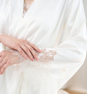 The effetto Satin Bridal Plus Size Mini Robe (S03423P) is a gorgeous, lightweight robe composed of super soft satin material that will keep you cool and comfortable. This robe features long sleeves and front wrap ties. The luxury lace is cut by hand and has a decadent look. This robe ends at mid thigh on most. Check out the ravishing effetto Satin Bridal Plus Size Spaghetti Strap Chemise (S03422P) for a coordinating sleep set, sold separately.