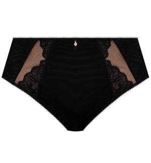 Elomi Cate Allure Full Panty Brief (302451) offers full coverage style with a satiny-soft fabric that lays comfortably against the skin without cutting or digging in. Features a high-rise waist that sits at or just below the navel on most women, plus side front panels featuring lace caught between the lining for added visual interest. This brief offers soft-edged elastic waist band with a flat finish for premium comfort, and provides full rear coverage.