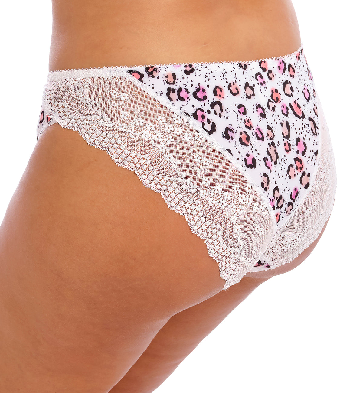 The Elomi Lucie Matching Stretch Lace Brazilian Brief (4495) updates the classic floral print with bright colors layered over a black base colorway in the fully-lined front panel, with black lace details along the hips. The back panel has moderate rear coverage with a cheeky look and features a semi-sheer leopard print lace top triangle with scalloped floral lace along the leg openings. High-cut leg openings fit and flatter a variety of figures. Designed to match Elomi Lucie Banded Stretch Lace Plunge Underwire Bra (4490).