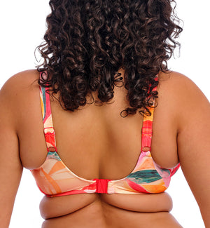 The Elomi Sancho Beach Bikini Top in Mango is bringing the summer heat with its plunge neckline, bold sunny print, and tropical vibes! This top is comfortable but secure and keeps everything in place even during active beach use. It has a plastic clasp instead of a three-hook clasp in the back, which means the band cannot be adjusted, but customers find the fit and longevity of Elomi swim tops to be great. I don't recommend ordering a larger band size for this top. Just order your usual UK bra size.