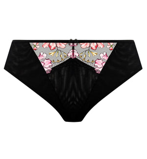 The show-stopping Elomi Teagan Thong (302670) is crafted from a double-layered, stretch mesh for just the right amount of coverage. Smooth, satin-look elastic waistband and back keyhole detail add a touch of glamour. This thong showcases a bold precision-embroidered panel with metallic yarn details that add a touch of sparkle.
