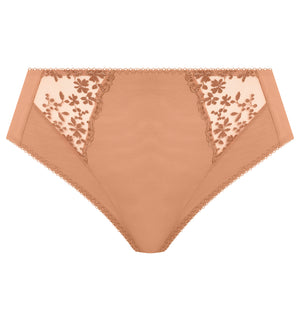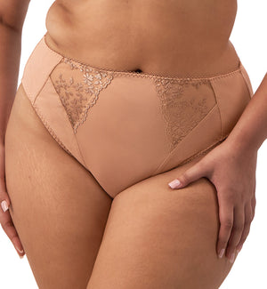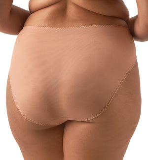 The Elomi Zarla High Leg Brief Panty in cafe au lait provides full coverage while remaining incredibly comfortable. Its mesh panel detail adds a hint of whimsical charm. They run true to size.