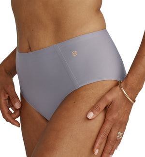 Evelyn & Bobbie High-Waisted Retro Bikini Panty (1704) is a retro-style brief panty with a high waist that sits just below the navel, featuring a cotton gusset and high-cut leg openings that flatter and visually lengthen the legs. This no-show panty is SUPREMELY comfortable and boasts double-bonded seams that lay flat under clothing (even leggings) to prevent visible panty lines. This retro panty offers moderate coverage, slightly cheeky along the outer rear. Evelyn & Bobbie dedicates their brand to a "do no harm" ethos, so your favorite undies are always BPA-Free, Latex-Free, Copper-Free, Nickel-Free, and Non-Toxic.