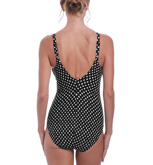 The Fantasie Santa Monica Twist Front Underwire Swimsuit (6728) features light tummy control and shaping, plus underwire cups for rounded shaping and support. This classic polka-dot swimsuit has a plunge neckline with twist-front detail for definition, plus low scoop back with adjustable shoulder straps. Featuers moderate rear coverage.