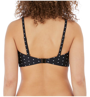 The Freya Jewel Cove Convertible Underwire Bralette Bikini Top (7239) gives you the sleek lines of a bralette-style swim top with underwire for support, lift, and rounded shaping. Double-strap shoulder details add visual interest, along with a black-and-white pin-dot polka dot pattern. Straps are adjustable and feature the ability to easily convert to a crossback-styling at your convenience.