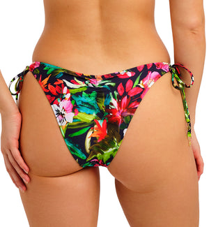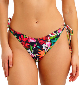 The Freya Kailua Shores High Leg Bikini Brief (207985) will have you hitting the waves in style with its colorful tropical print, fusing this swim season's trending colors of hot pinks, fiery oranges and luscious jades across a rich navy background. This exotic bikini bottom features a low rise waist and sits high on the hips on most. The leg openings are a flattering higher cut to elongate your legs. The back offers skimpy rear coverage. You can adjust the side ties for the perfect fit.