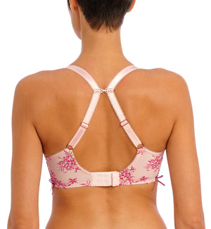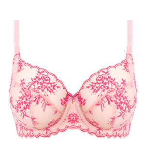 Freya's Offbeat Decadence is a full-coverage style bra. I love all the detailing that Freya added to this bra. The bra's contrasting lace is a striking feature, and the side lace-up ribbon is simply adorable. The light pink and hot pink color combo is lovely and delicate. The bra also has a j-hook that makes it convert into a racerback style, which will give your breasts a nice plump look, plus if you have narrow shoulders, this will help keep your straps firmly on your shoulders. While the lace material provides a light, flattering fit, it is not intended for firm lift or heavy support, so if you have very heavy breasts, I would recommend trying Freya's Catwalk or Rose Blossom instead. Offbeat Decadence's band runs on the firm side. If you are in-between band sizes, I would order one band size up and one cup sized down. Otherwise, order your usual size.
