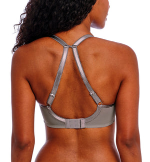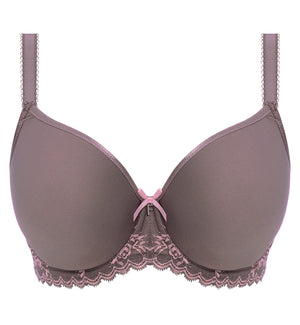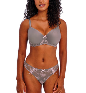 Freya Offbeat Decadence Spacer Molded Underwire Bra (402510) features seamless spacer foam contour cups that are lightweight and provide a supported and naturally rounding shape. The upper elastic trim provides a secure hug along the upper breasts. Fully adjustable straps have a J-hook that can be moved and adjusted to perfect how this optional racerback design fits your body and shoulders. While the cups are smooth and hide under clothing, the contrast lace detail along the band elevates this t-shirt bra for a budoir look hidden under your everyday outfits! Pair with Freya Offbeat Decadence Lace Brazilian Panty (402571), sold separately, for a luxurious lingerie set.